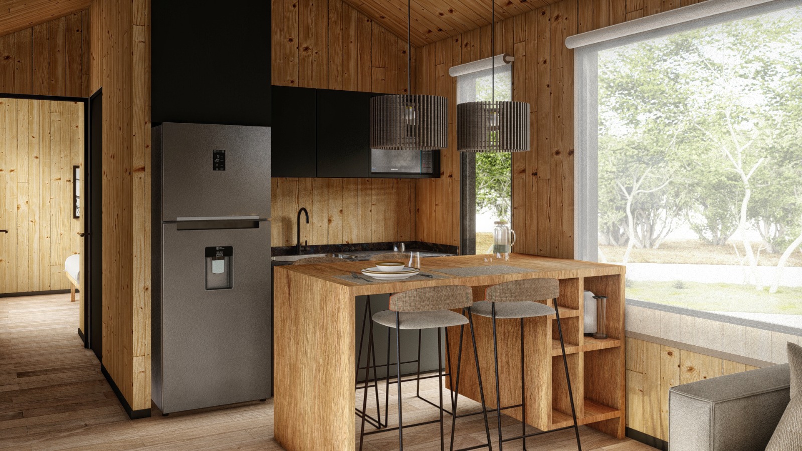 Nuestros lodge están diseñados con cocinas a medida equipadas con electrodomésticos de alta gama Samsung, Hisense, Telefunken y Nespresso.